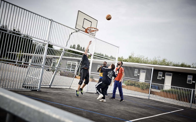 - Vi har udendørs multibane til basket, fodbold og hockey og der er trampolin, hængekøjer og gode mulighed for udfoldelser til spil eller leg i haven.